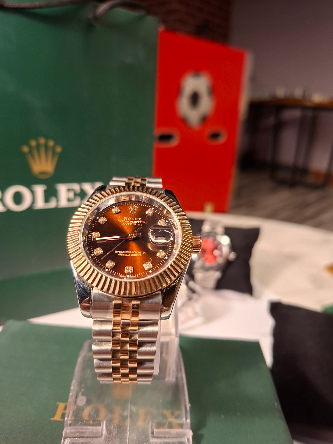 # Rolex Watch – Silver and Chocolate Elevate your wrist with this distinguished Rolex timepiece,...